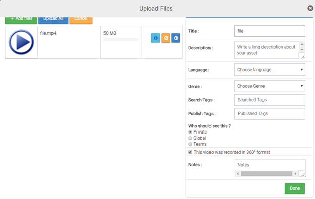 - If the metadata is not inserted for the Video, click on the checkbox provided in the Asset Properties and click on Done