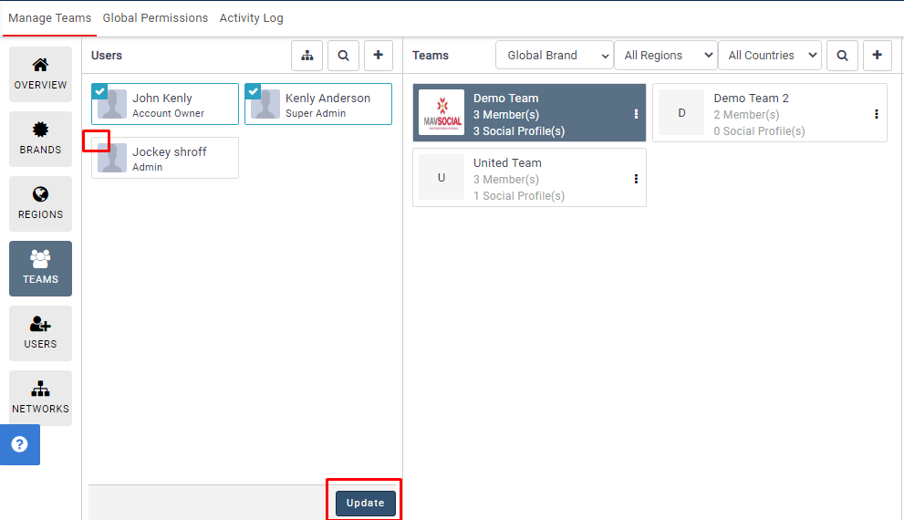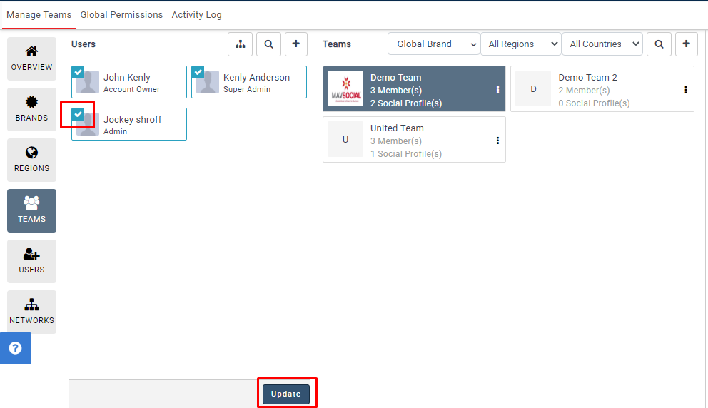 - You will see your Teams in the middle and the users on the left side. To remove a user from one of your teams, just unselect the user and click on the update button.