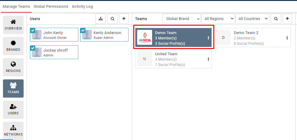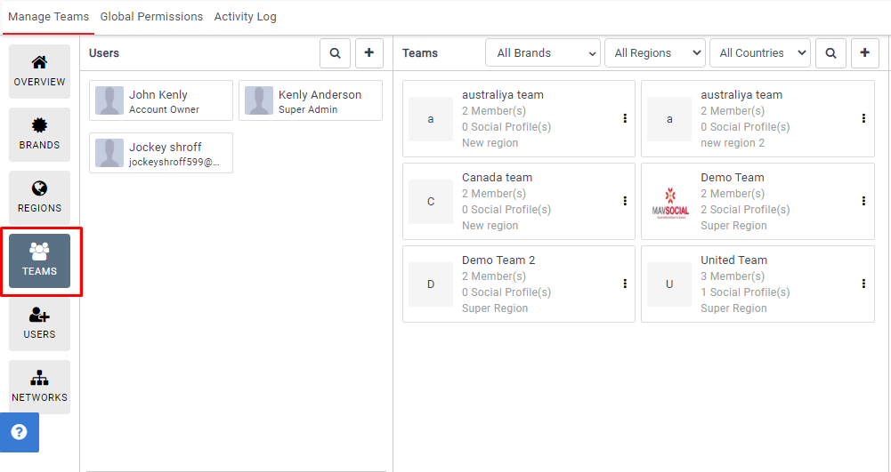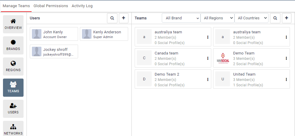 In the Overview section, you can view the teams and brand’s structure. After creating Brands, Regions, Teams, Members, and Social Networks, you can see the hierarchical structure. By clicking on each component, you can directly go to relevant details.