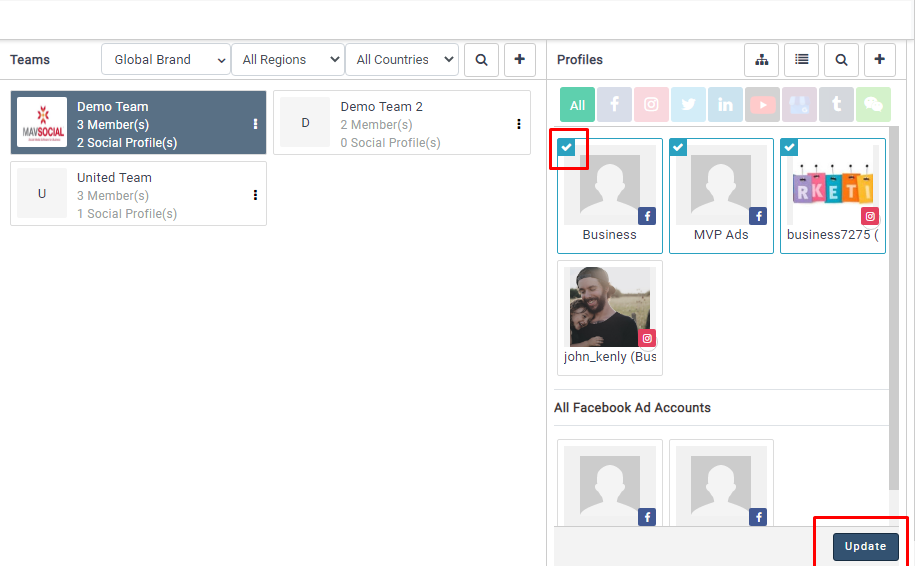 - You will see your Teams in the middle and the profiles on the right side. To add a profile to one of your teams, just select the profile and click on the update button.