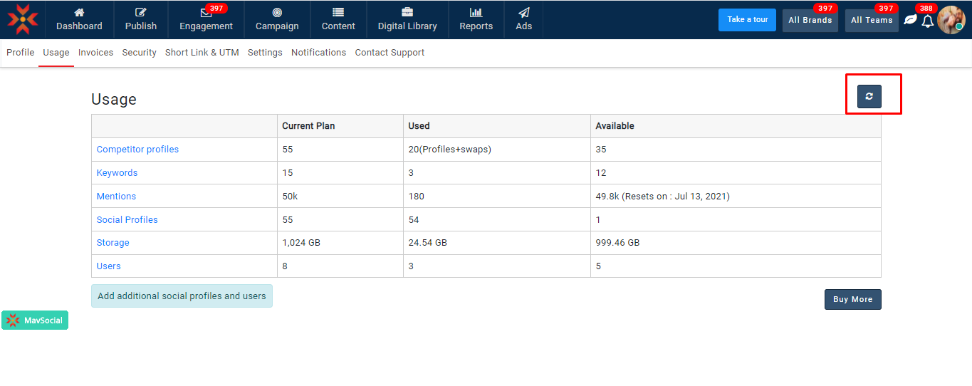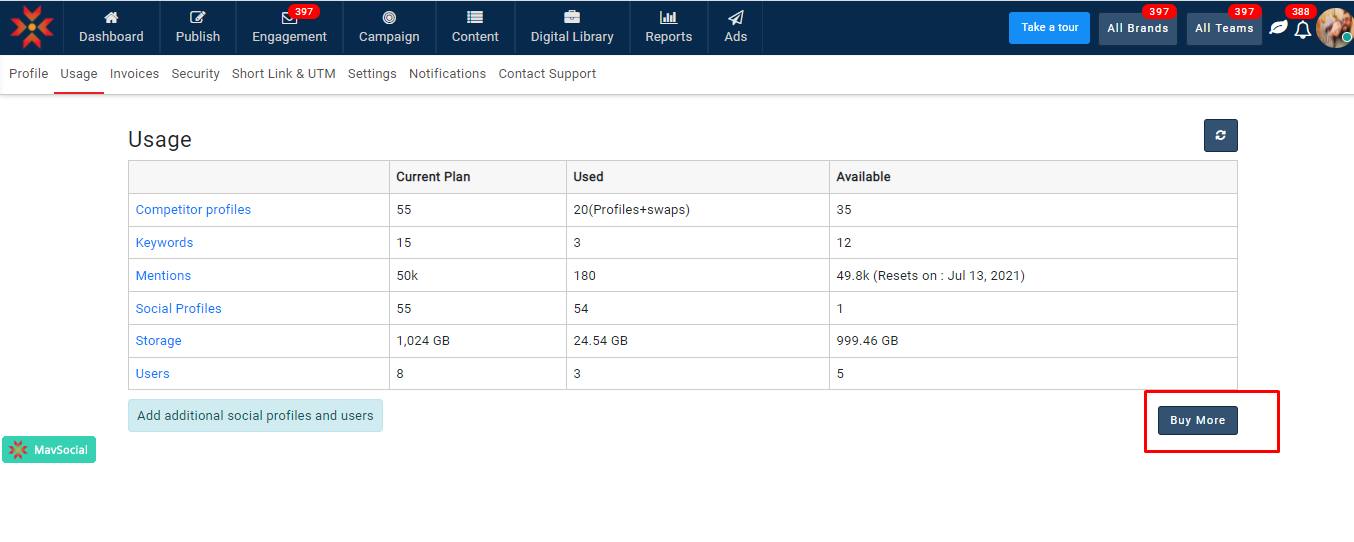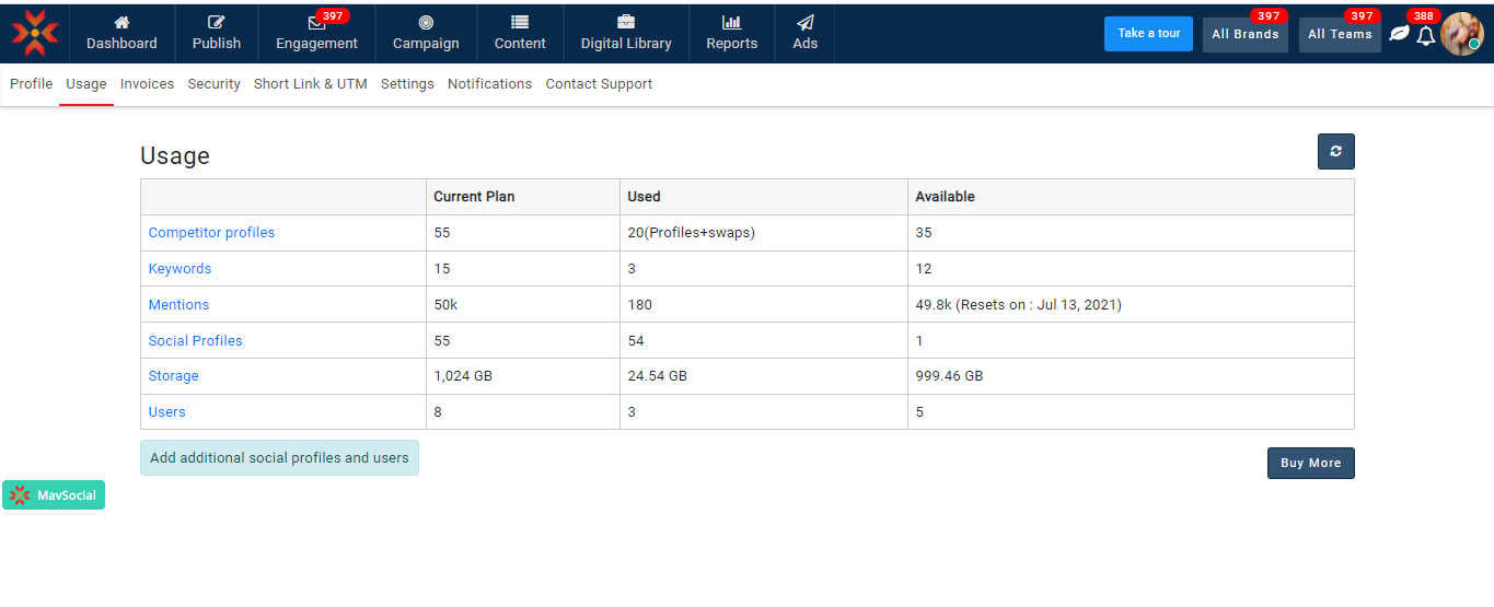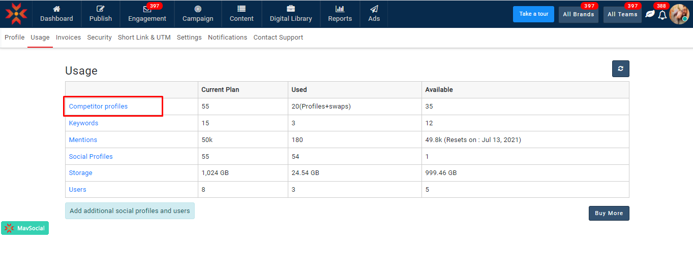 This allows you to see the limits of social profiles, competitor analysis, social listening, and users.