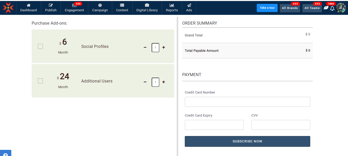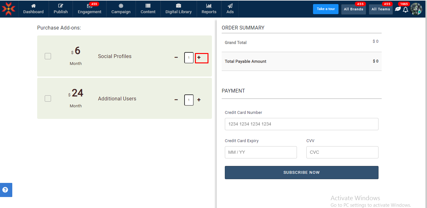 7. Click on the plus(+) icon to add additional users and social profiles and make the payment