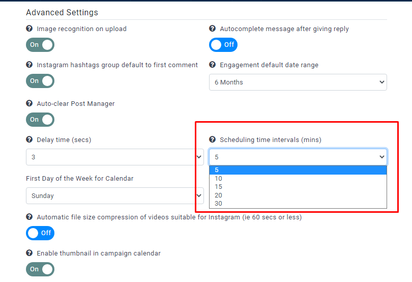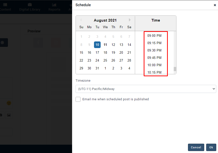 - If you select the 15 mins interval, the available post scheduled time slots will display with 15 mins difference